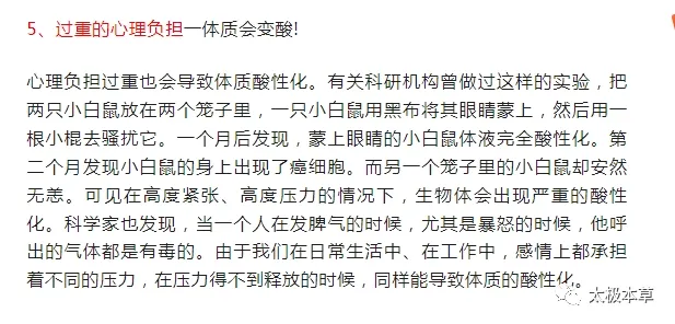 大致上,您每吃一份肉,就需要吃至少四份以上的蔬果才能平衡其带来的酸性,加上各种辐射、污染、压力、坏心情等也会令身体酸性化。这就是为何只有10%的人体质是碱性的。日本医学博士柳泽文正用实验证明100%的癌症患者是酸性体质;诺贝尔奖获得者、德国生物化学家Otto Warburg博士认为缺氧的环境使正常细胞癌变,而体液酸化是导致缺氧的主要因素。