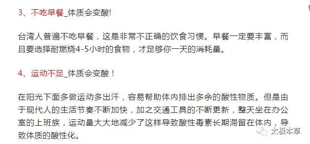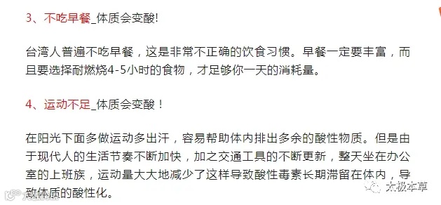 4、对皮肤的影响:偏酸的体液使皮脂腊的微酸性状态受到破坏,失去了对细菌的抑制作用,易引发痤疮、毛囊炎、疖肿等感染性皮肤病。据调查,80%痤疮患者的体液偏酸。粘稠度增高,血循环减慢,黑色素及酸性产物在皮下瘀积,晚出现色素斑、皮肤干燥,以及皮肤弹性差、晦暗、提前衰老等。此时皮肤还处于高敏感状态,极易过敏。