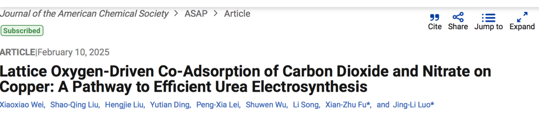 Xiaoxiao Wei, Shao-Qing Liu, Hengjie Liu, Yutian Ding, Peng-Xia Lei, Shuwen Wu, Li Song, Xian-Zhu Fu*, and Jing-Li Luo*, Lattice Oxygen-Driven Co-Adsorption of Carbon Dioxide and Nitrate on Copper: A Pathway to Efficient Urea Electrosynthesis, J. Am. Chem. Soc. 2025