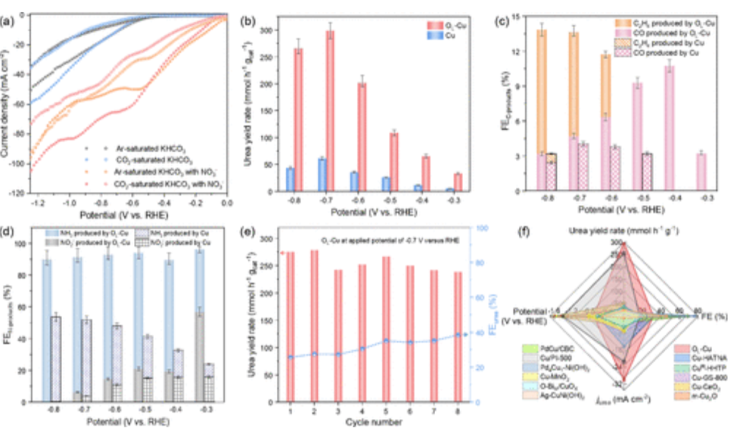 有鉴于此,深圳大学骆静利教授(加拿大国家工程院院士)、符显珠教授等使用氧化物衍生得到的含有晶格氧的Cu纳米片催化剂(OL-Cu)电催化还原合成尿素。