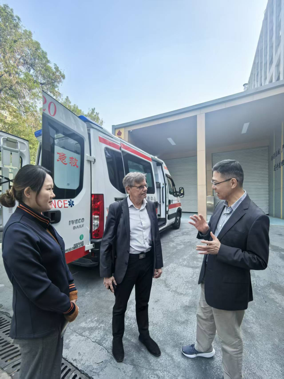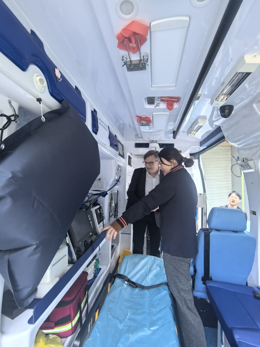 专家团首先前往中心救护车停放区域参观。急救管理科城西分站长沈佩为Freddy教授进行了详细讲解,重点介绍了长途转运救护车,该车专为满足市民日益增长的长途转运需求而设计,曾成功完成最远1700公里患者的转运任务,又专门介绍了我中心所有救护车及急救设备的配置均与国际标准接轨,可满足患者的现场救治及转运需求。