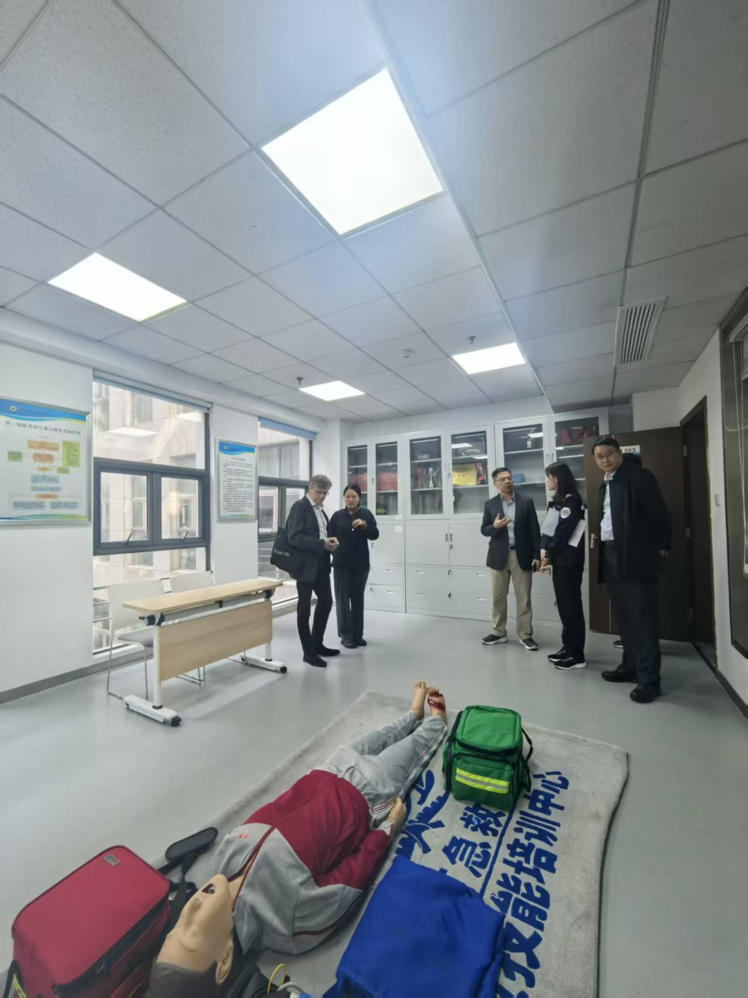 接着,专家团前往三楼科教培训中心。刘声声详细介绍了科室职能与近年来的建设成果。作为南京市院前急救从业人员的核心培训基地,科室承担着院前急救从业人员岗前培训、市民科普宣教及美国心脏协会(AHA)课程认证等工作。现场展示了各类专业培训室,包括团队心肺复苏、团队创伤、高级生命支持、气道管理培训室等,同时呈现了QCPR模型、成人气道管理模型、高级生命支持模拟人等先进教学设备。刘声声分享,自2017年以来,已累计组织院前从业人员培训183期,覆盖4892人,院前急救岗前培训合格率始终保持100%。此外,还与东南大学、南京特殊教育师范学院、江苏卫生健康职业学院等高校建立深度合作,分别承担大学生社会实践教学、残疾人急救教学实践、“双师型”教师联合培养等任务,形成了“培训–实践–储备”一体化人才培养模式。