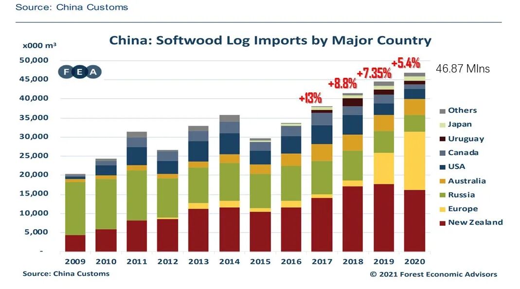 回看多年来的针叶原木进口走势,我国针叶原木进口已经连续六年进口量持续增长,虽然树种和货源地每年都在变化,过去两年来欧洲云杉以特有的性价比成为市场的新宠。在2020年下半年欧洲云杉的单月进口量超过了长期霸主地位的新西兰辐射松,全年进口量超过了1300万立方米。加上目前澳松进口处于停摆状态,420万立方米的缺口对于不同地区的货源提供了更多的机会,对于云杉原木持续的市场需求量和价格都有更多的想象空间。