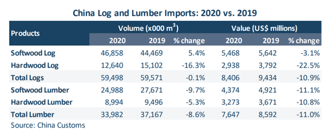 从2020年整体木材进口状况来看,针叶材原木保持了持续增长态势(总量增加+5.4%),而针叶材板材下跌接近10%,硬木原木和板材都出现了不同程度的下跌。针叶原木具有较强的市场需求支撑,抗跌性强。