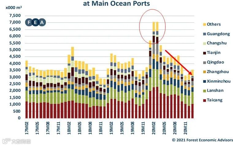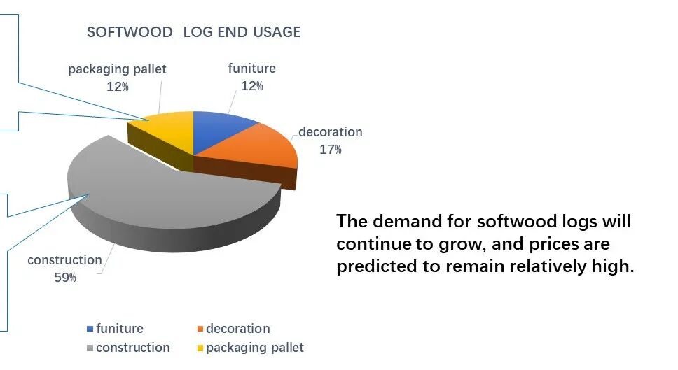 从针叶原木的用途来看,建筑工地口料是大头,基建房地产基本盘估计仍会稳步发展。托盘包装用途方面,由于海外报盘板材价格高货源少,很多用户在转向原木,本地锯木厂加工托盘料和包装材会呈持续增加态势。同样,由于针叶家具材云杉的高价(US350/M3),家具生产商也会更多使用在本地锯木厂直接用原木定制加工的板材。我们可以预测,国内市场上在板材涨价的带动下,云杉原木的价格仍然有很大的上涨空间,辐射松原木价格超过2018年的历史高位160美元/立方米似乎指日可待。