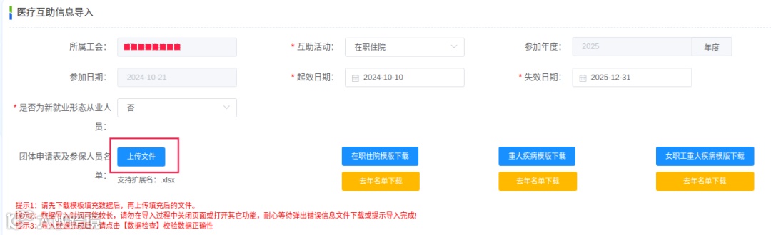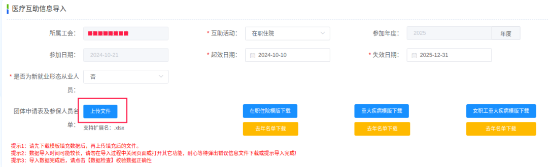 2.4点击“互助活动”选择类别,导入对应的互助项目模板,上传有关社会保险结算凭证图片,点击“数据检查”,点击“导入”。