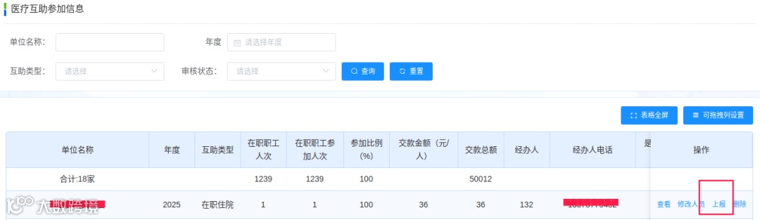 在左边菜单栏中点击“医疗互助信息”,选择“医疗互助参加信息”点击上报:数据检查无误,点击“上报”,显示提交成功。