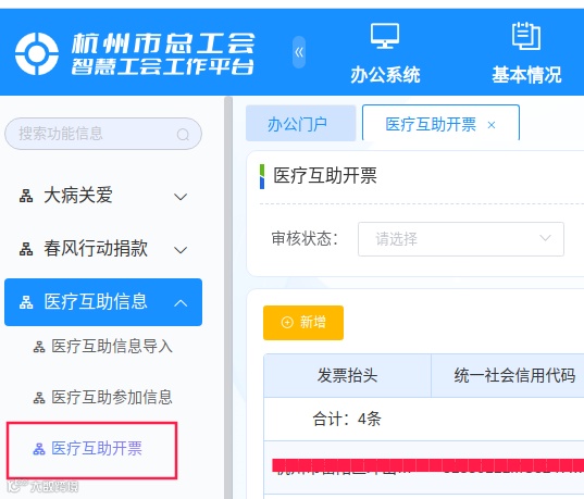 4.1 在左边菜单栏中点击“医疗互助信息”,选择“医疗互助开票”