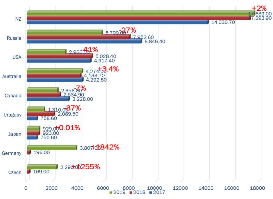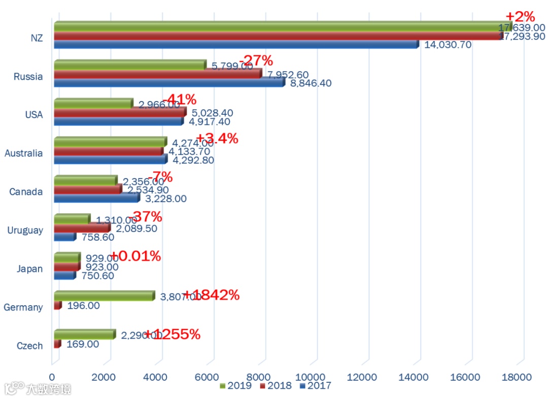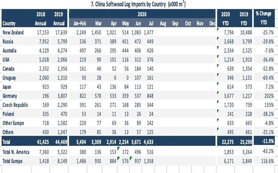 根据我国2019年的进口数据,澳松进口量为427.4万立方米,比前一年增长了3.4%.占到全部针叶材原木进口总量的10%.位列新西兰和俄罗斯之后,远超美国和加拿大.在去年的针叶原木供应国当中.澳大利亚是过去三年供应非常稳定的国家,今年1-7月份澳松的的进口量233万立方米,仅下降7.6%,受疫情的影响并不太大,同一时期新西兰松进口量同比下降了25.7%.