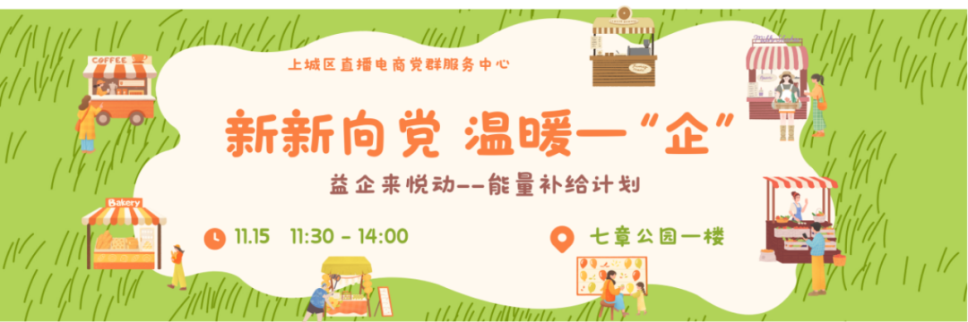11月15日(11:30-14:00),由上城区直播电商党群服务中心主办的新新向党 温暖一“企”系列活动将在七章公园开启,现场组织了各类精彩活动,只为让每一个来到这里的朋友,都能感受到满满情绪价值。
