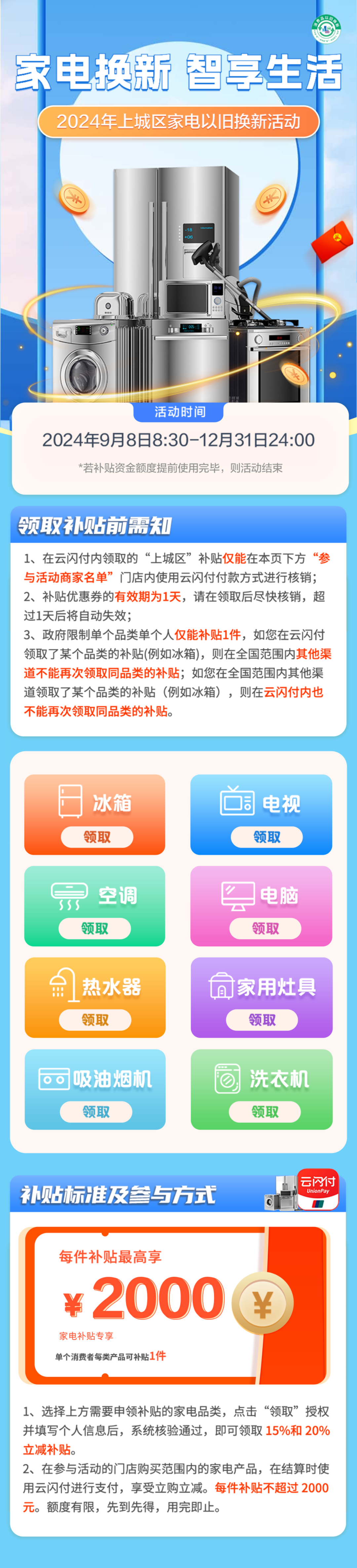 好消息,9月8日,上城新一轮家电以旧换新全面启动!对个人消费者直接新购8类家电产品给予15%或者20%补贴,最高补贴16000元!首批通过实体门店参与,线上平台正在上线中~