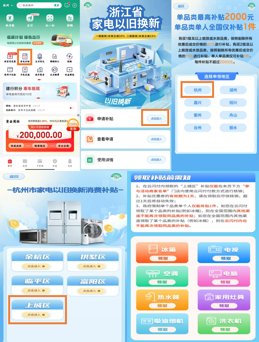 1.点击“申请补贴”,选择“杭州市”进入家电以旧换新补贴活动领取页面。