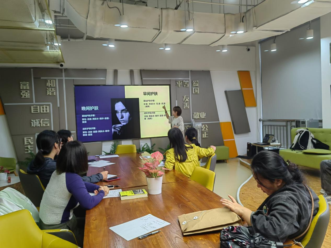 本次课程邀请到杭州市活动中心的专业美妆老师进行授课。主要内容是如何快速、高效画出日常妆容。同时,为增加多样性、趣味性,老师从日常护肤入手,内容从妆前护肤品的选择到化妆手法以及妆容与发型、服装搭配,耐心讲解理论知识,细致演绎每一步骤。