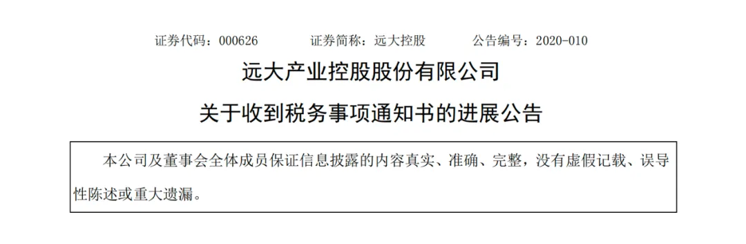 远大产业控股股份有限公司关于收到税务事项通知书的公告