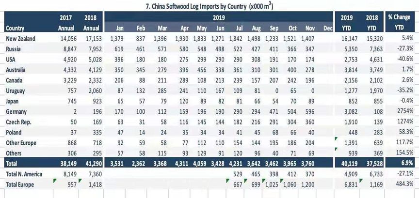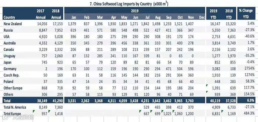 在2019年第三季度,从俄罗斯进口的原木处于近20年以来的最低水平。过去几年中,中国市场唯一的其他重大变化是乌拉圭的松木原木出货量增加。