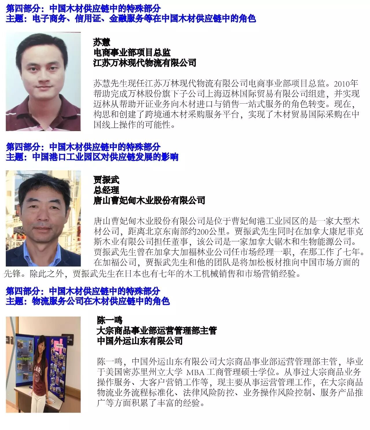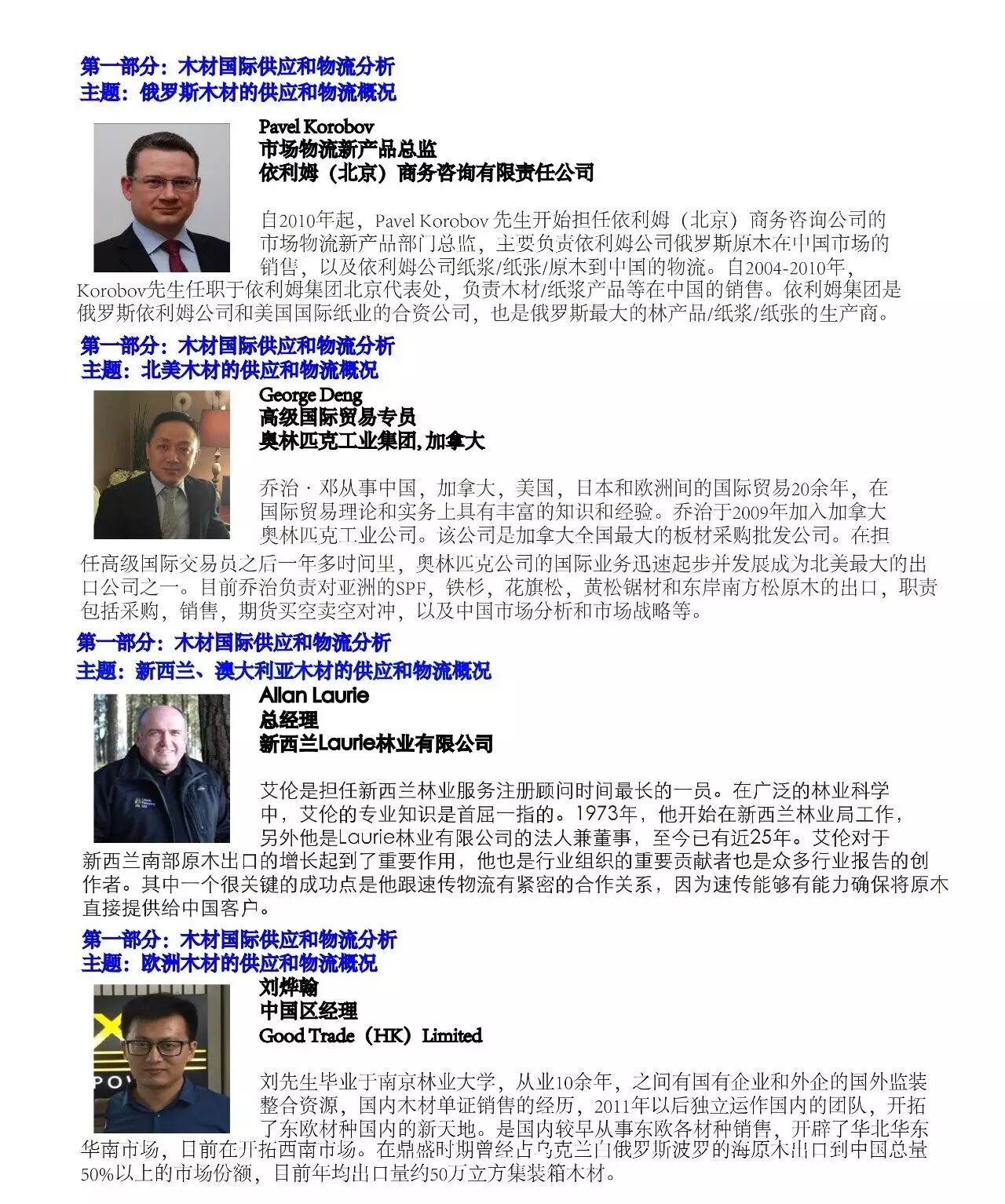 本次会议所邀请的海外演讲嘉宾来自俄罗斯、乌克兰、加拿大、新西兰等木材出口源头国家,国内的演讲嘉宾也是来自进口木材供应链的不同部分,他们都是行业内的实践专家,不但拥有丰富的行业经验和独特的见解,而且对行业现状和未来有着持续的探索。