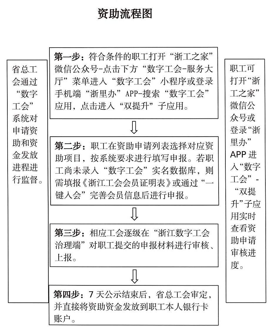 符合条件的职工可登录“浙工之家”微信公众号或手机端“浙里办”APP—“数字工会”—“双提升”应用在线填报或核对个人基础信息、证书信息、银行卡信息等申请资料并点击提交。