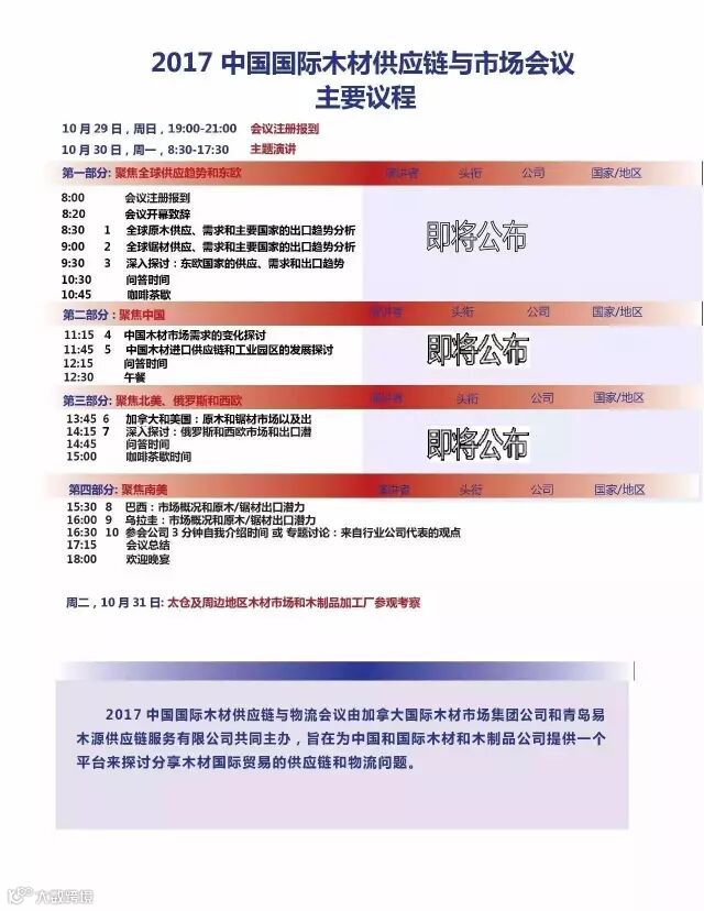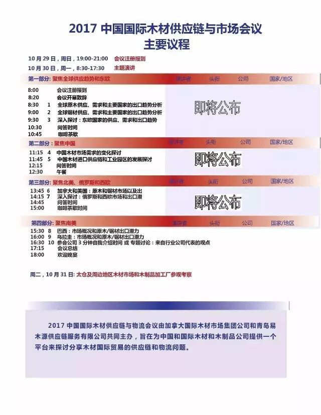 2017中国国际木材供应链与市场会议由加拿大国际木材市场集团公司和青岛易木源供应链服务有限公司共同主办,旨在为中国和国际木材木制品公司提供一个平台来探讨分享木材国际贸易的供应链和物流问题。