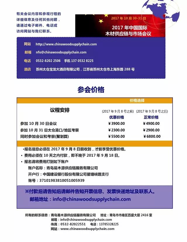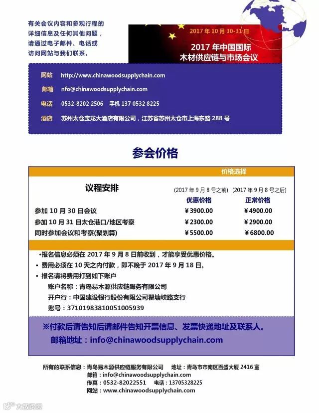 2017中国国际木材供应链和市场会议将于10月30日在太仓举办。这是第二次由国际代表和中国代表共同参与探讨关于软木原木和锯材供应到中国的供应链和贸易问题的会议。