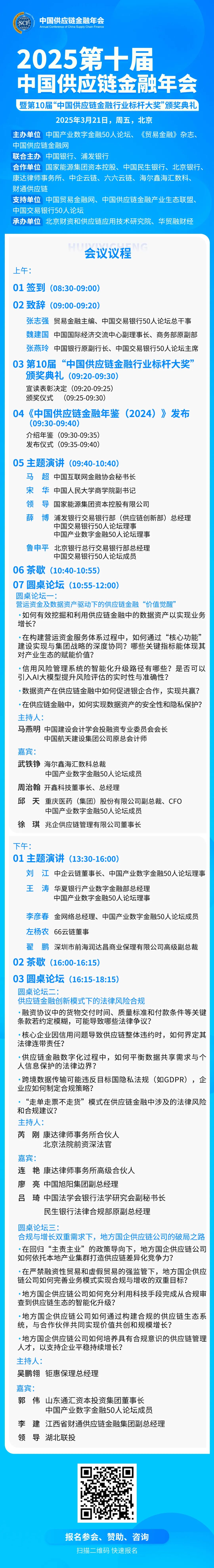 在此背景下,【第十届中国供应链金融年会】定于2025年3月21日在北京盛大启幕。本次年会荣幸邀请到超20位重量级嘉宾,涵盖政府、行业权威专家、金融机构以及科技企业领航者等齐聚一堂,深度探讨供应链金融行业的数字化转型战略,分享成功案例,洞悉前沿趋势,并促进业界的广泛交流与合作。此外,还有来自全国各地的超200多位集团企业、央国企核心企业及其上下游、银行金融机构、保理公司、金融科技公司以及第三方公共服务机构的高层管理者也将莅临现场,共襄盛举。