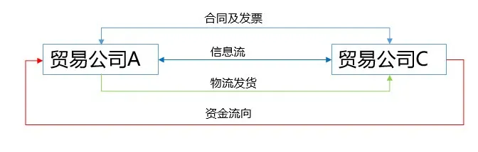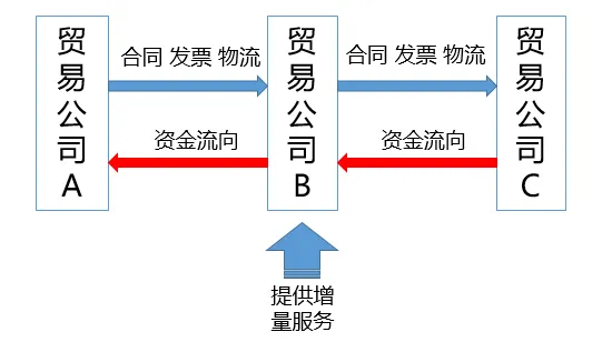 ④C公司回款给B公司,B公司回款给A公司,并且账面留存了贸易利润这就构成了一个完整的贸易闭环,在这其中,A公司与C公司之间确实存在贸易关系。而B公司的参与,原有的贸易角色得到改变,使客户B公司实现了销售收入。客户B公司此时就像一家居间公司跟双方进行贸易,所有的数据都会经过B公司,达到贸易量营收的增加,开票量的增加,这些数据都是真实有效的,四流合一,合同、发票、物流、资金真实存在,没有税务风险。为了让增量业务B加入,甚至可以把B的上下游接入多家,避免了业务量过于集中。