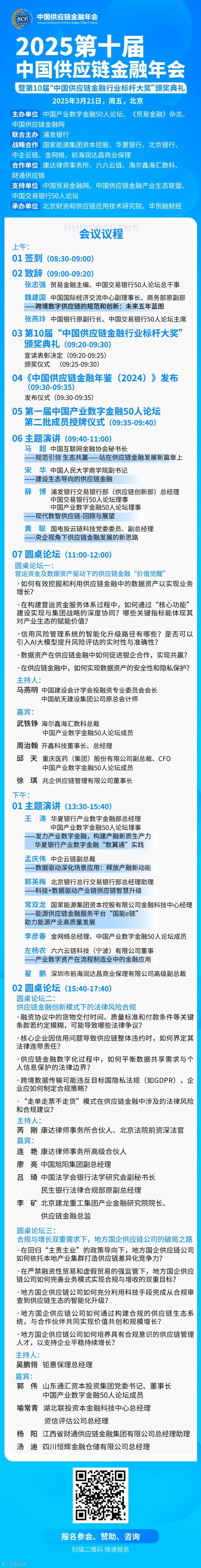 在此背景下,【第十届中国供应链金融年会】定于2025年3月21日在北京盛大启幕。本次年会荣幸邀请到超20位重量级嘉宾,涵盖政府、行业权威专家、金融机构以及科技企业领航者等齐聚一堂,深度探讨供应链金融行业的数字化转型战略,分享成功案例,洞悉前沿趋势,并促进业界的广泛交流与合作。此外,还有来自全国各地的超200多位集团企业、央国企核心企业及其上下游、银行金融机构、保理公司、金融科技公司以及第三方公共服务机构的高层管理者也将莅临现场,共襄盛举。