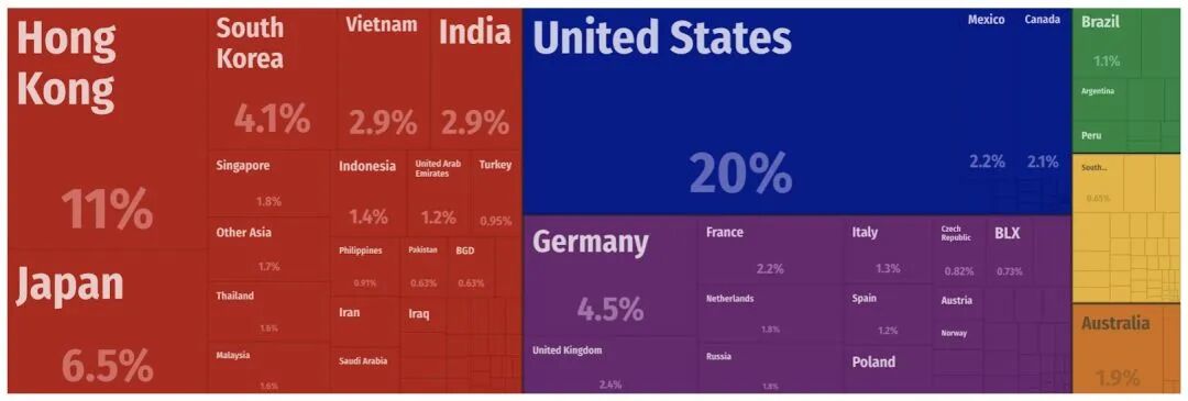 目前中国前三大的出口目的地为美国、中国香港、日本,其次是欧洲国家,如德国、英国和法国。
