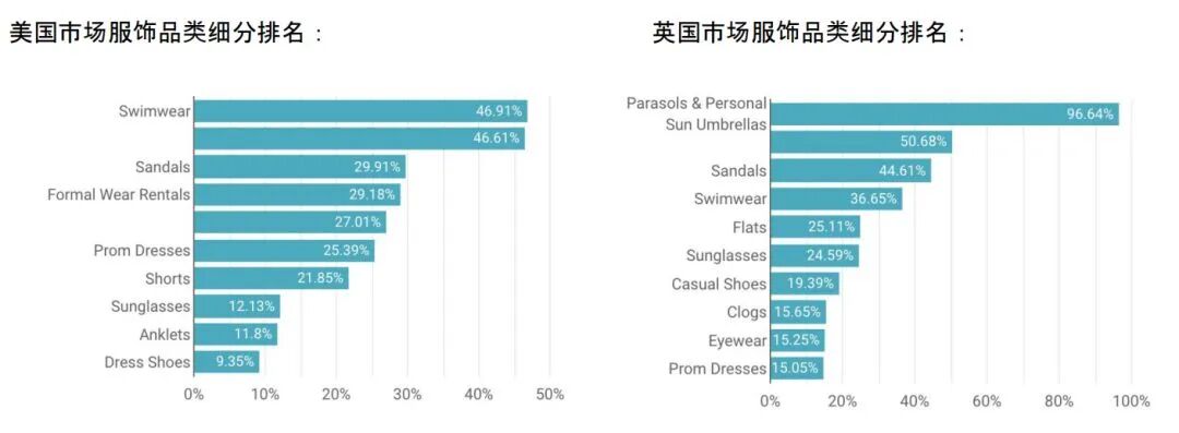 其中美国前三受欢迎的细分产品分别为泳装、凉鞋、以及出租正装;在英国户外遮阳伞、凉鞋、以及泳装的消费需求最为旺盛。