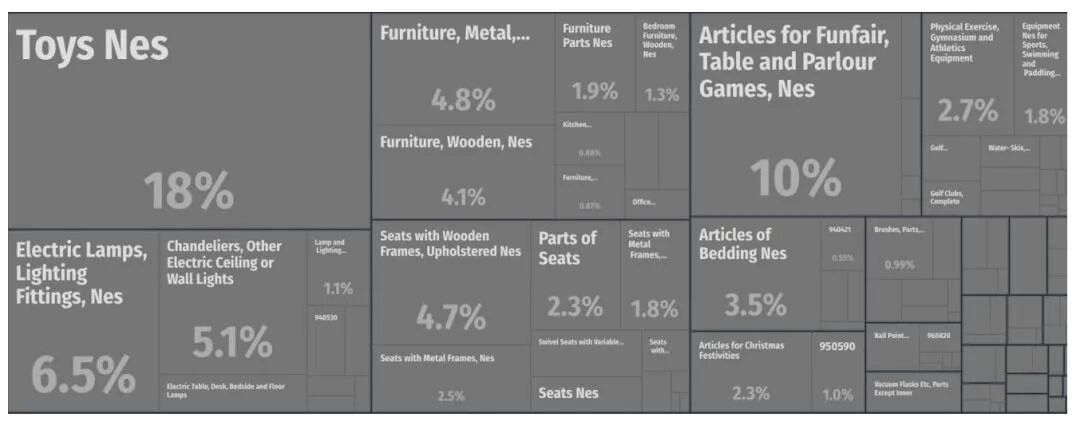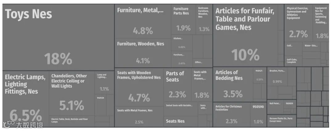 除此之外,热门出口品类还有玩具、灯饰、家居等,值得注意的是室内娱乐类产品 (例如桌游)是仅次于玩具类产品的热门类别。