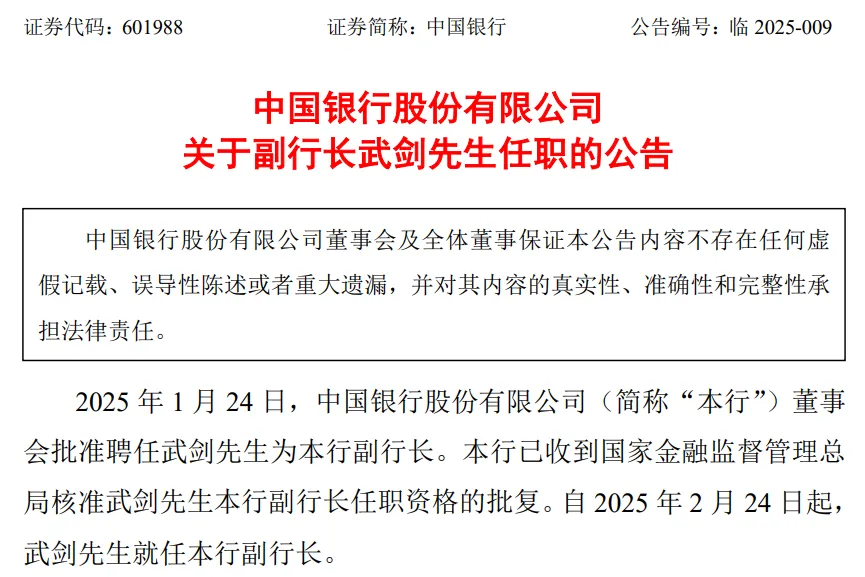 根据相关规定,自2025年2月24日起,武剑就任中国银行副行长。