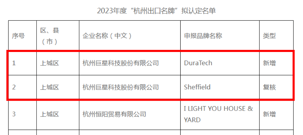 日前,杭州市商务局公示了2023年度“杭州出口名牌”名单,全市共91个品牌入选,上城区3个,其中智慧城企业杭州巨星科技股份有限公司2个品牌入选。