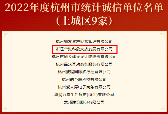 3月27日,区统计局公布“2022年度杭州市统计诚信单位”名单,通过前期宣传发动、实地核查、推荐申报、综合评估、会议审定等环节,上城区共有9家企业入选,其中智慧城企业浙江华滋科欣文旅发展有限公司连续两年获评该荣誉。
