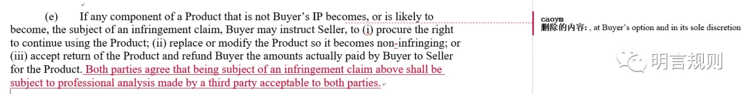 简评:对方要求,以对方独立判断产品是否涉嫌侵权,其有权要求笔者客户替换产品、接受退回产品并退还货款。涉及知识产权侵权时,对方如此要求算是合理的要求。笔者这么修改,删除了“at Buyer's option and in its sole discretion ”, 增加了内容“Both parties agree that being subject of an infringement claim above shall be subject to professional analysis made by a third party acceptable to both parties.”。