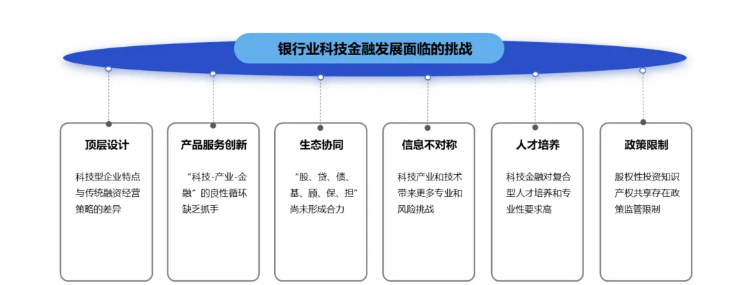从实践层面看,结合调研情况分析,银行机构所面临的挑战主要集中在以下关键领域:在顶层设计方面,银行战略与组织架构制约了科技金融的创新与发展;在产品服务创新方面,银行需要寻找新的方法来适应科技企业的特殊需求;在生态协同建设方面,银行需要与科技企业、投资机构等多方合作,共同构建支持科技金融发展的生态系统;信息不对称问题是最为主要的障碍,科技企业与银行之间在信息共享和透明度方面存在差异;专业人才培养是解决认知不对称的关键,银行需要培养更多既懂科技又懂金融的交叉人才;配套政策的不完善对银行的业务开展也造成了一定的制约和影响。