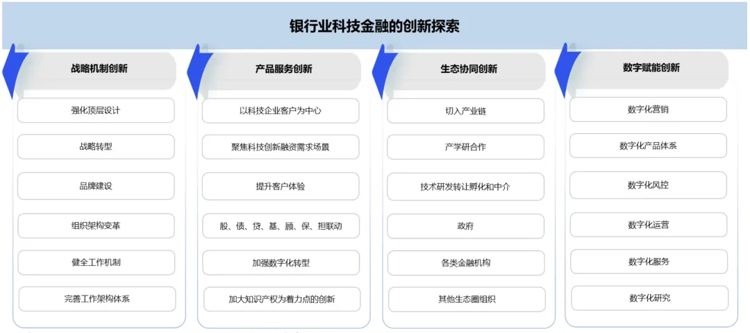 曾刚介绍,《银行业科技金融创新与发展报告》课题组过多轮实地访谈调研发现,领先的银行机构已经围绕战略机制创新、产品服务创新、生态协同创新以及数字赋能创新等几个重点方向,在科技金融领域进行了诸多的创新探索,比如: