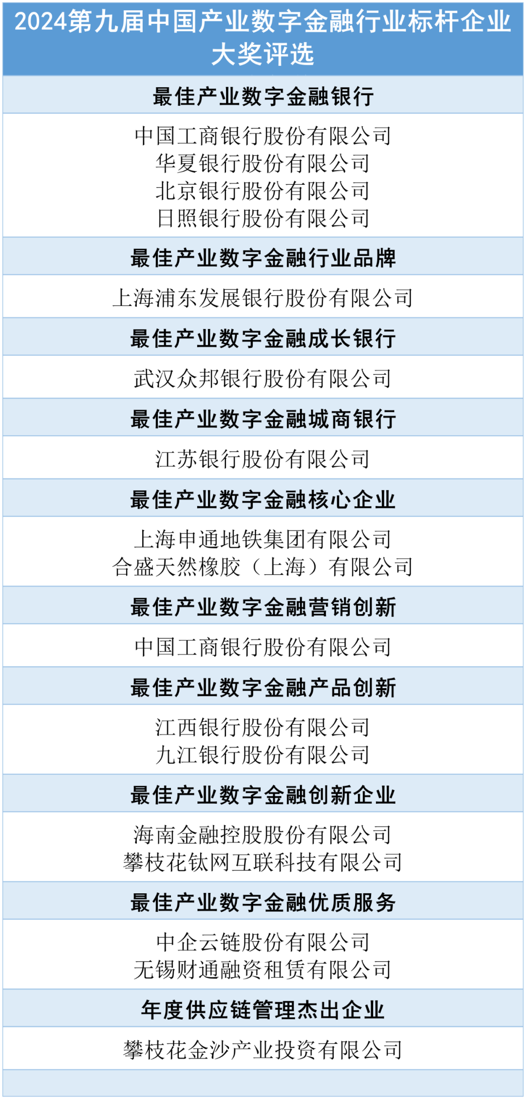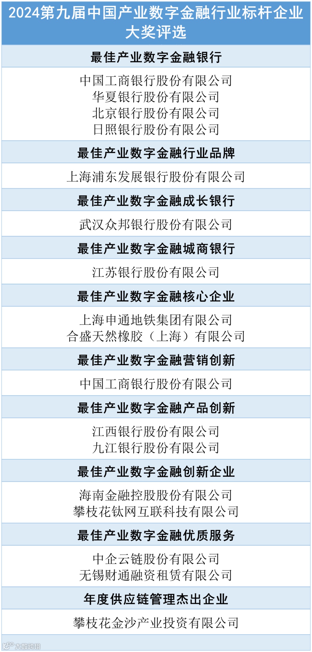 自2024年9月起,经过近3个月的对外宣传,以及企业自评材料的申报、专家评审环节后,2024第九届中国产业数字金融行业标杆企业大奖评选结果最新出炉。