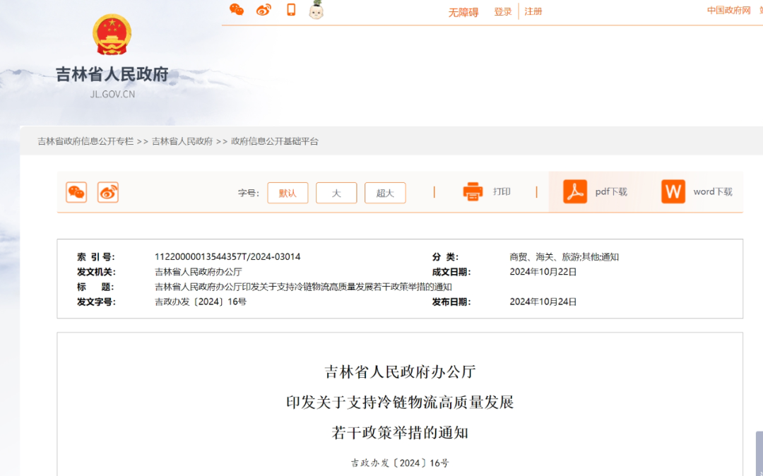10月24日,吉林省人民政府办公厅发布《关于支持冷链物流高质量发展的若干政策举措》(以下简称“政策举措”),提出支持符合条件的地区申报创建国家级、省级骨干冷链物流基地和冷链物流集配中心,加快补齐冷链物流基地(中心)内基础性、公共性、公益性物流基础设施短板;支持冷链物流基地(中心)运营主体或冷链物流龙头企业整合优化冷链存量资源,布局建设产地“最初一公里”和销地“最后一公里”冷链物流网络等举措。