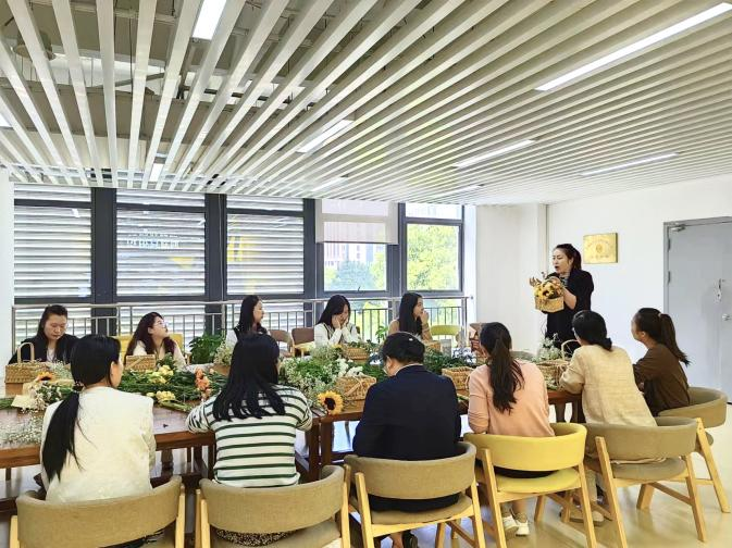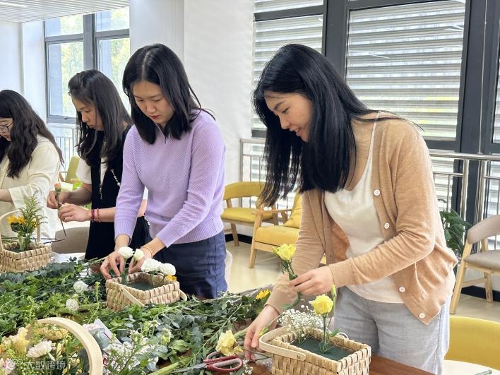 活动现场,花艺师向职工传授了中国传统插花艺术的精髓,包括形态结构、色彩搭配以及空间布局等方面的知识。随后,在专业花艺师的指导下,职工们全身心投入到插花艺术的实践中。职工们在学习及实践过程中互相交流心得,协作共创,制作出充满生命力与艺术感的作品。