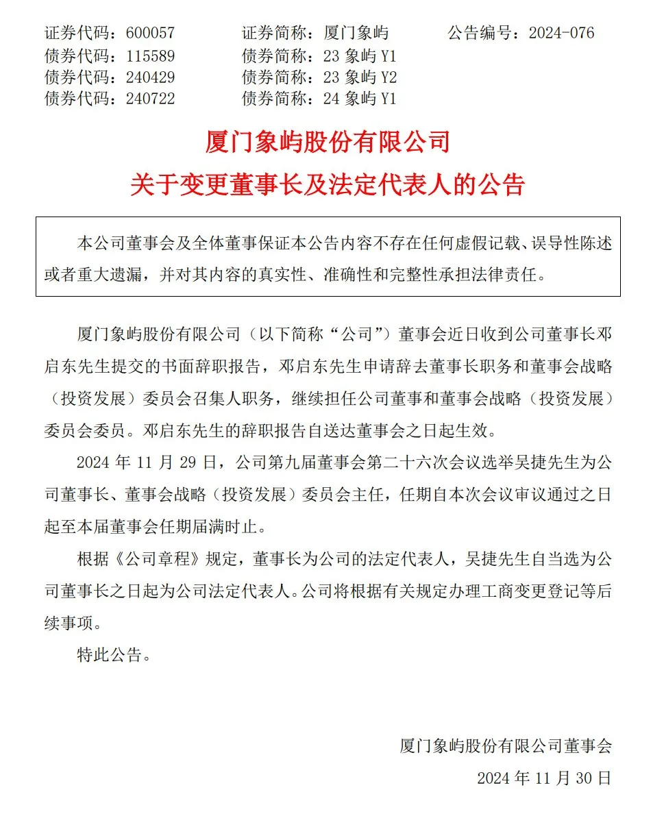 厦门象屿第九届董事会第二十六次会议选举吴捷为公司董事长、董事会战略(投资发展)委员会主任,任期自本次会议审议通过之日起至本届董事会任期届满时止。