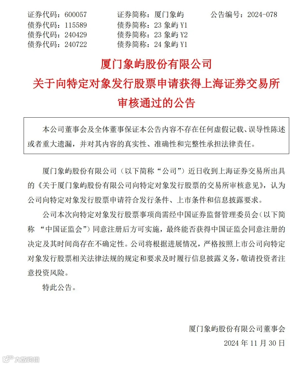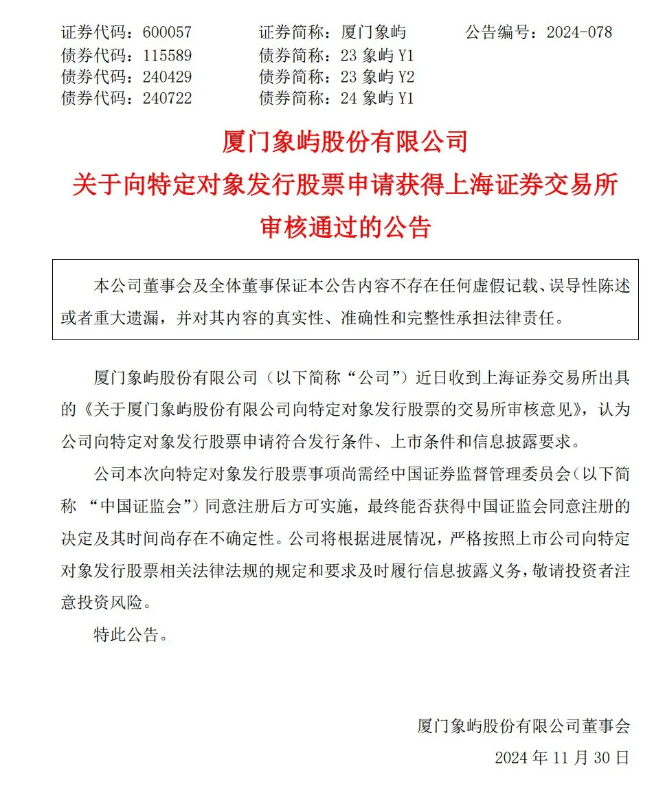 11月29日晚,厦门象屿股份公告称,公司近日收到上海证券交易所出具的《关于厦门象屿股份有限公司向特定对象发行股票的交易所审核意见》,认为公司向特定对象发行股票申请符合发行条件、上市条件和信息披露要求。本次发行事项尚需中国证监会同意注册后方可实施,最终能否获得及时间存不确定性。公司将按规定及时履行信息披露义务,敬请投资者注意投资风险。