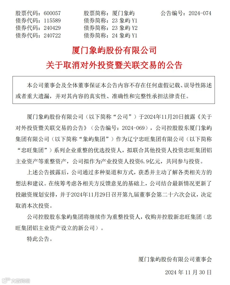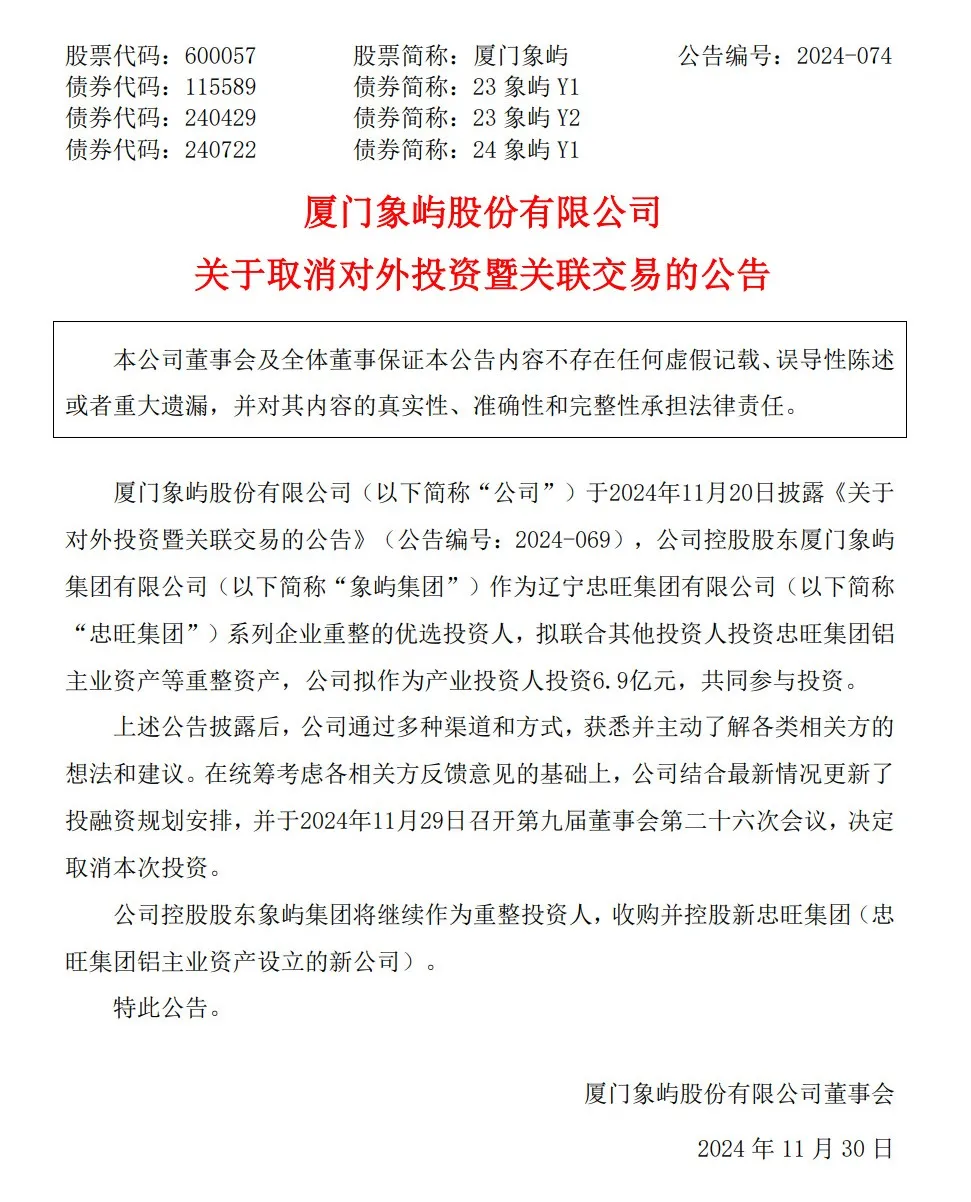 厦门象屿11月29日晚公告,公司于2024年11月20日披露《关于对外投资暨关联交易的公告》,公司控股股东厦门象屿集团作为辽宁忠旺集团有限公司系列企业重整的优选投资人,拟联合其他投资人投资忠旺集团铝主业资产等重整资产,公司拟作为产业投资人投资6.9亿元,共同参与投资。