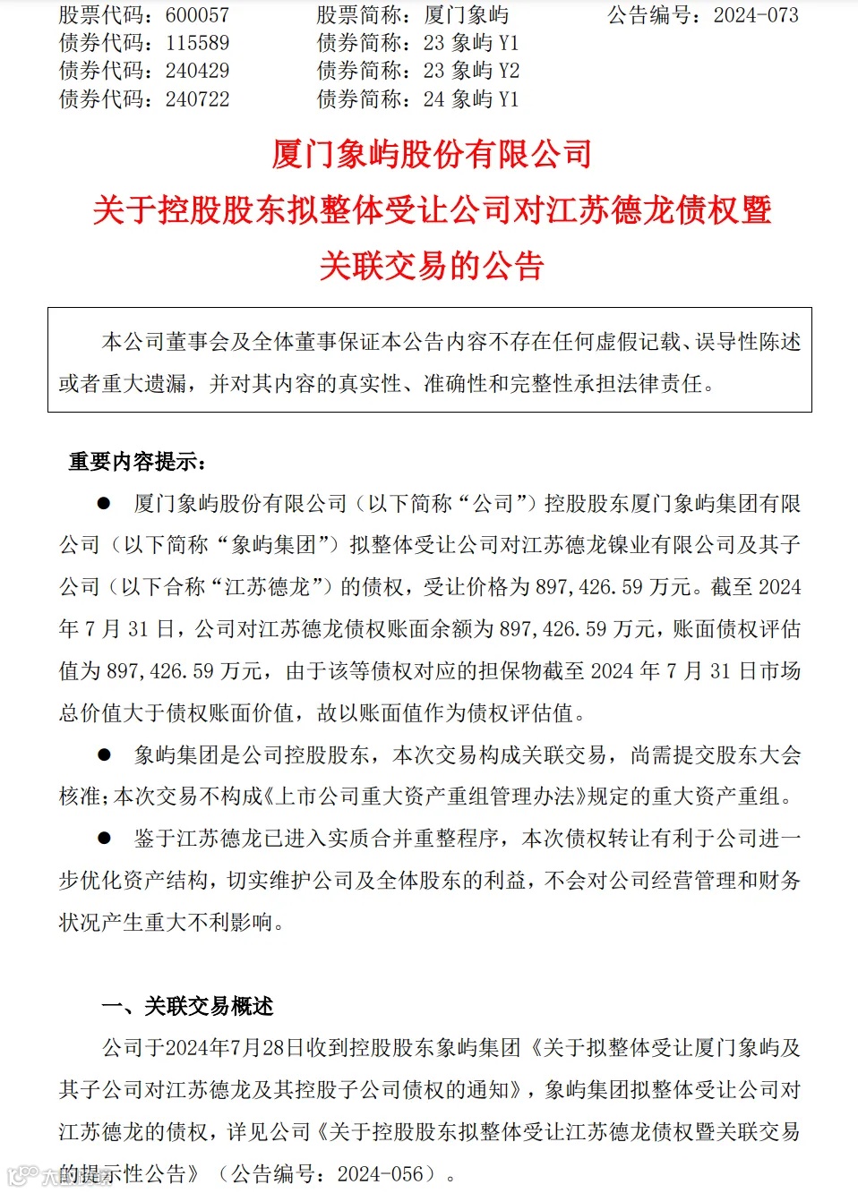 公告称,象屿集团是公司控股股东,本次交易构成关联交易,尚需提交股东大会 核准;本次交易不构成《上市公司重大资产重组管理办法》规定的重大资产重组。鉴于江苏德龙已进入实质合并重整程序,本次债权转让有利于象屿股份进一步优化资产结构,切实维护公司及全体股东的利益,不会对公司经营管理和财务状况产生重大不利影响。