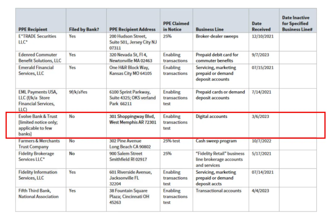 通过上述分析可知,《联邦存款保险法》第29条中的"主要目的特例"(primary purpose exception,PPE)与"独家存款安排"exclusive deposit placement arrangement)为银行吸收存款留下了更多可操作的通道。在实践中,银行可根据需要向FDIC申请主要目的特例(PPE),此次Synapse破产事件中涉及的Evolve银行就在2023年3月申请了PPE,以此规避对存款的经纪性质认定。