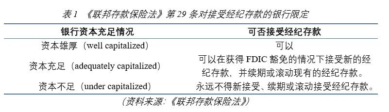 由于核心存款通常长期稳定、成本可测、且不易受利率波动的影响,对于银行而言意义重大。相比之下,经纪存款受到利率变化的影响较大、粘性较低、流动性较高,因而被认为是银行风险较高的资金来源。此外,基于更长更复杂的交易关系,经纪存款更有可能出现其他形式的干扰,比如存款经纪人潜在或实际的破产,都会进一步提高银行面临的风险。因此,《联邦存款保险法》第29条对能接受经纪存款的银行进行了限定,只有资本雄厚、财务稳健的银行才有资格募集和接受经纪存款;资本充足的银行在取得特别豁免的情况下可以接受这类存款;资本不达标的银行则完全不允许接受此类存款。同时,FDIC还对经纪存款的利率进行了限定,除资本雄厚(well capitalized)的银行除外,其他银行提供的存款利率不得超过"全国平均利率"加上75个基点。这里的"全国平均利率"是指所有银行及其分支机构对于相同规模和期限的存款支付的利率的简单平均值。