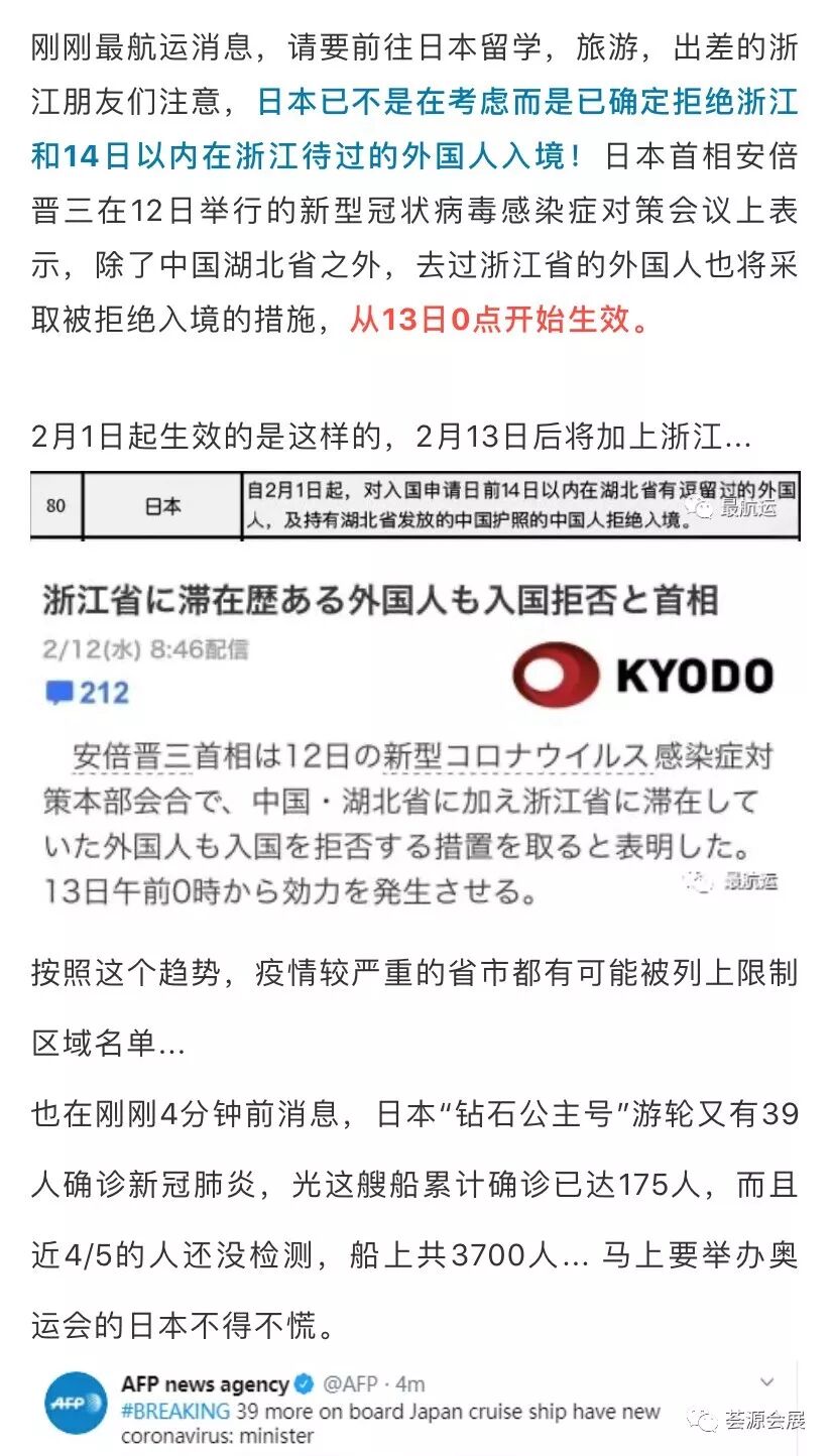 导读:最航运消息,请要前往日本留学,旅游,出差的浙江朋友们注意,日本已不是在考虑而是已确定拒绝浙江和14日以内在浙江待过的外国人入境!