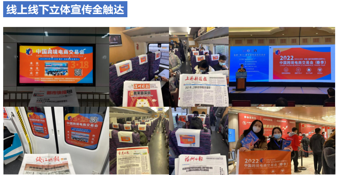 近两个月,中国跨交会首次到境外举行现场推介活动,浙江、福建、广东等地地铁广告陆续上线,同时搭乘高铁,驰骋上海、宁波、武汉、杭州、福州、厦门、广州、深圳、重庆、南昌等全国跨境电商重点城市,一路吸睛无数。中国跨交会充分利用线上渠道,对展会进行数以十亿级曝光,宣传火力全开,传输展会精彩,触达行业同仁。