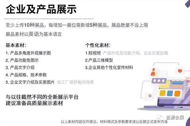 参加网上广交会的企业需要准备基本素材和个性化素材,我们可以通俗的理解为:基本素材就是达标项,个性化素材就是加分项。