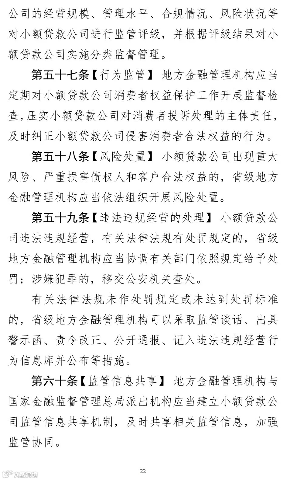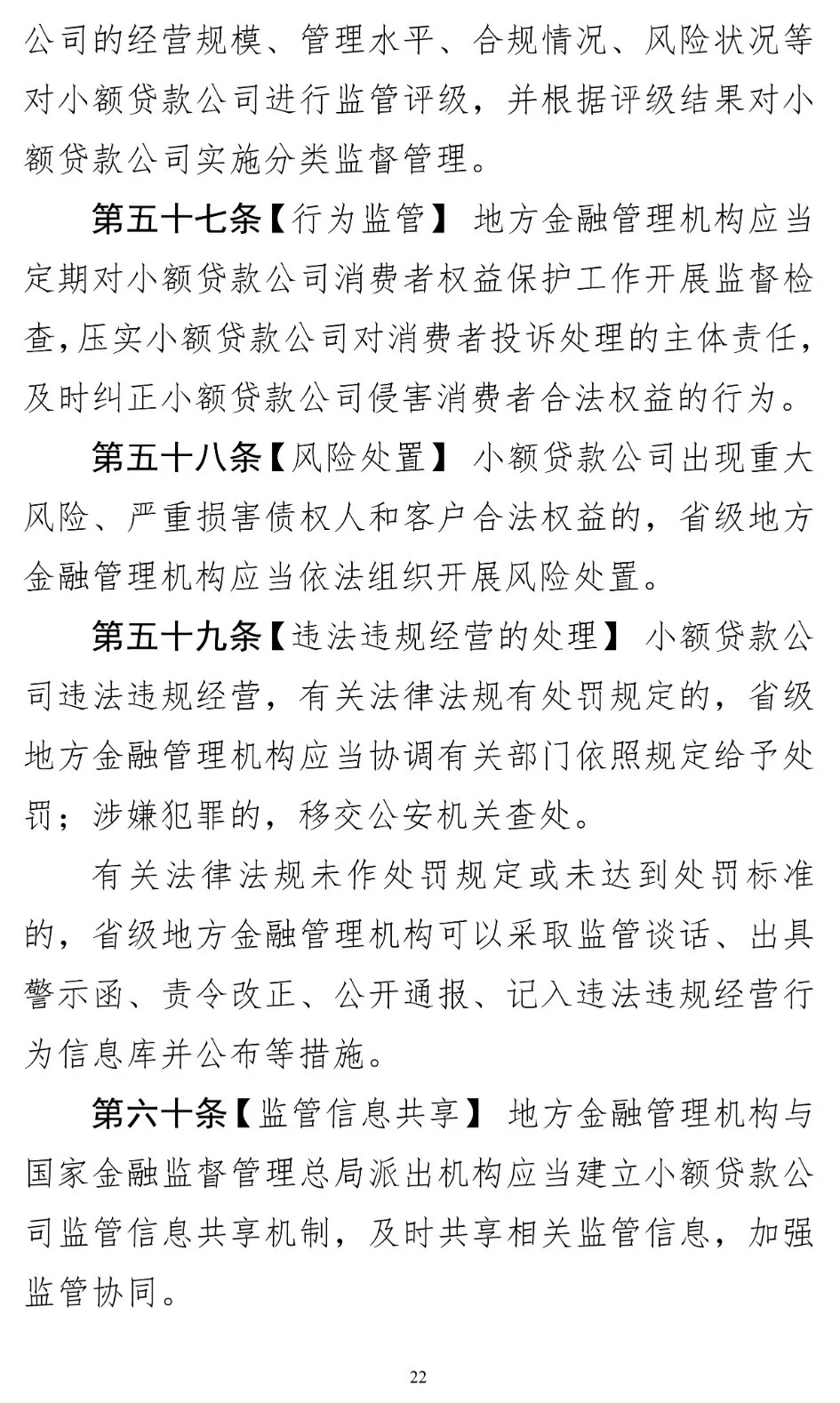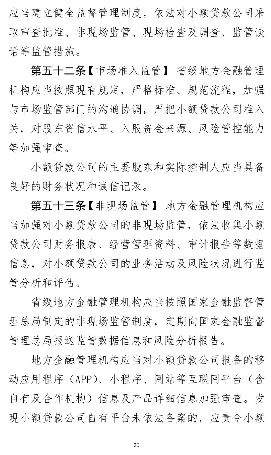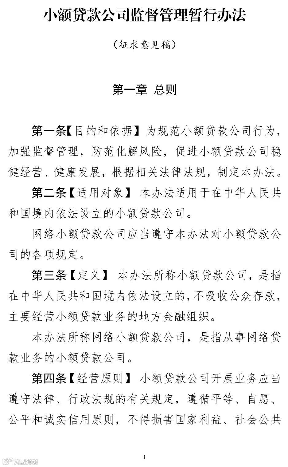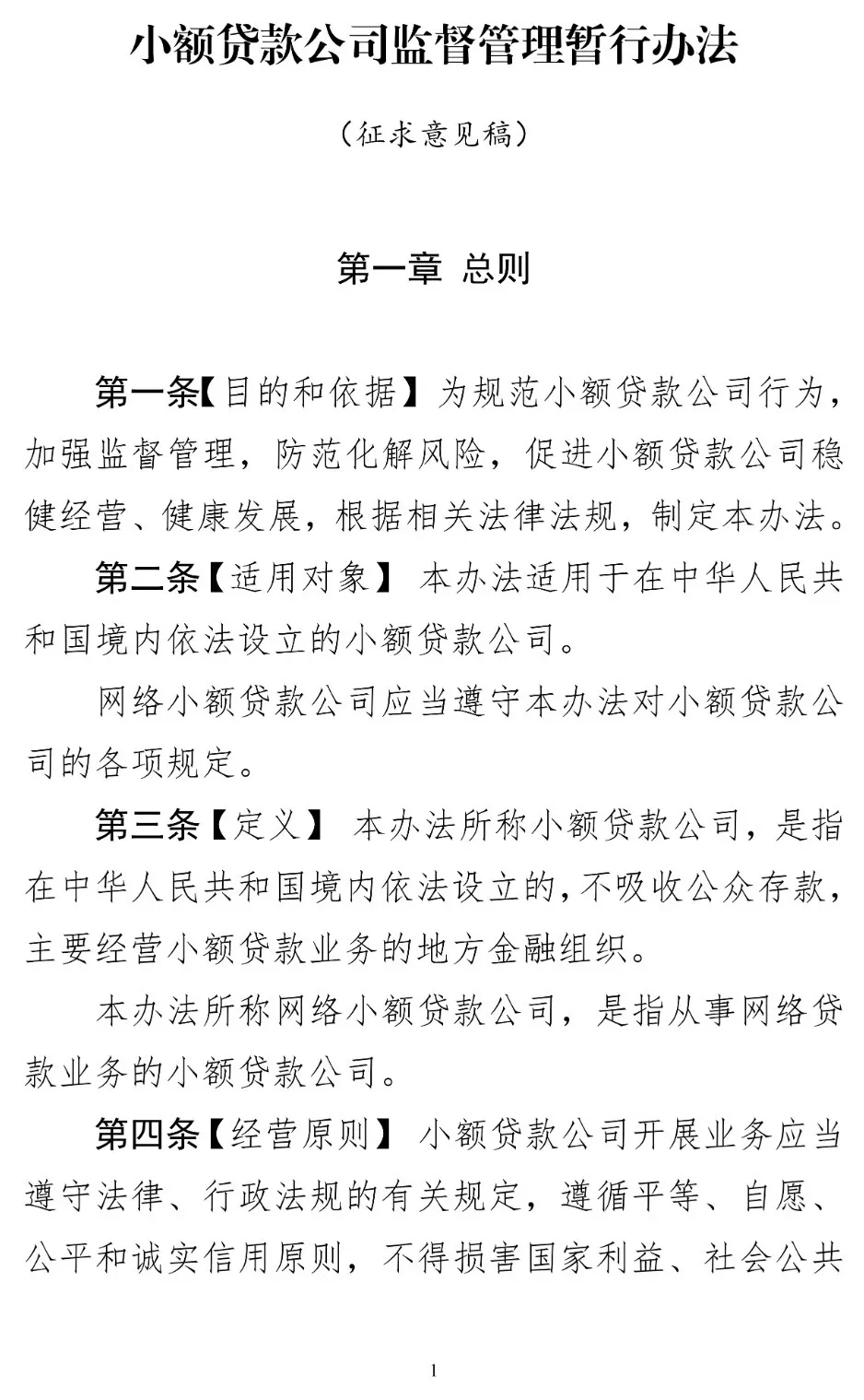 为规范小额贷款公司行为,加强监督管理,促进小额贷款公司稳健经营、健康发展,国家金融监督管理总局研究制定了《小额贷款公司监督管理暂行办法(征求意见稿)》(以下简称《暂行办法》),日前正式向社会公开征求意见。《暂行办法》共七章、六十六条,分别为总则、业务经营、公司治理与风险管理、消费者权益保护、非正常经营企业退出、监督管理、附则。