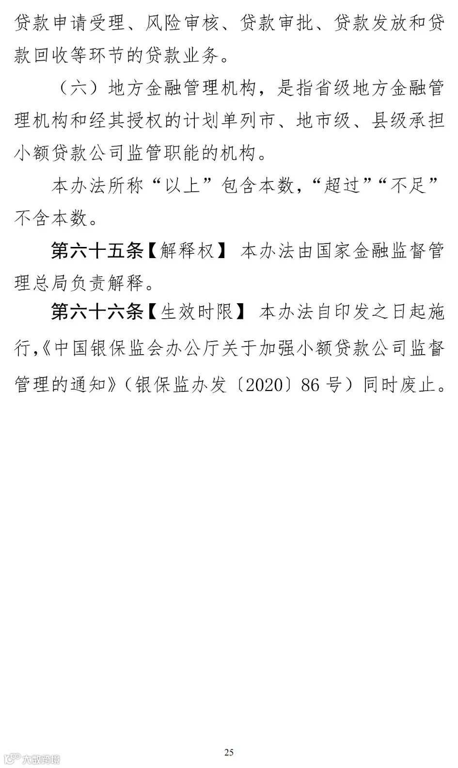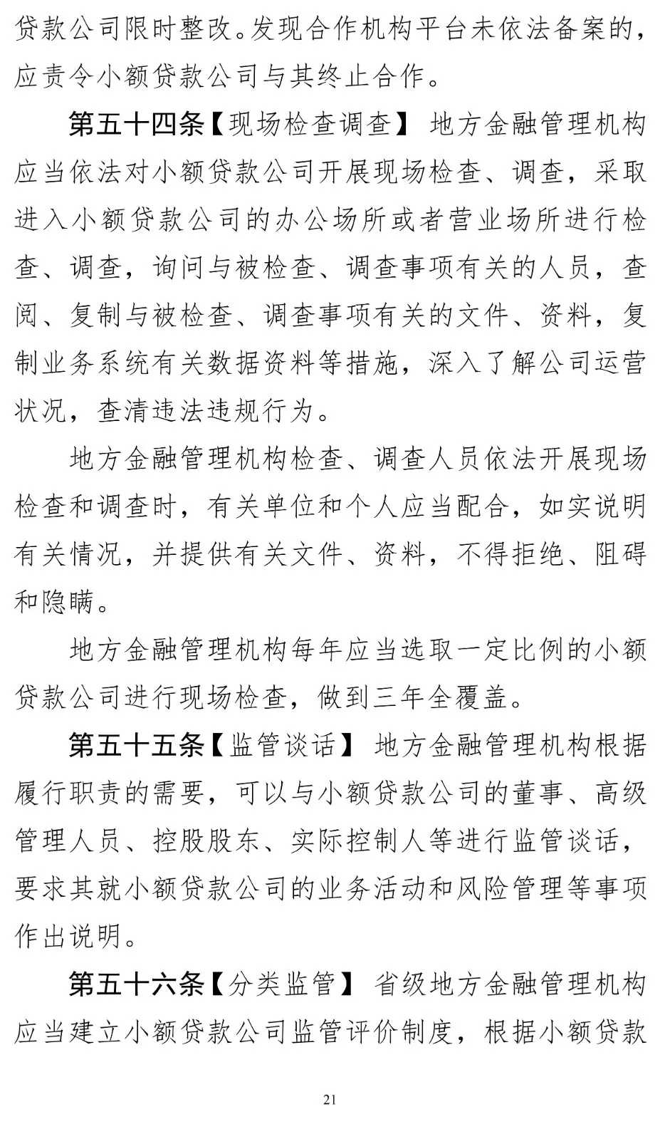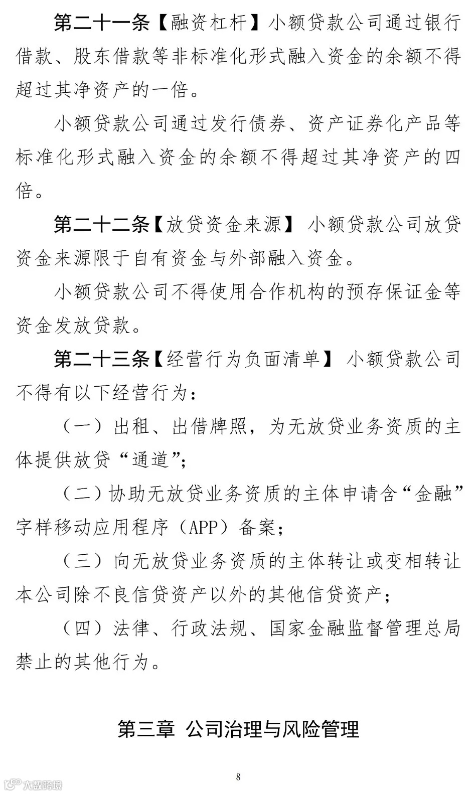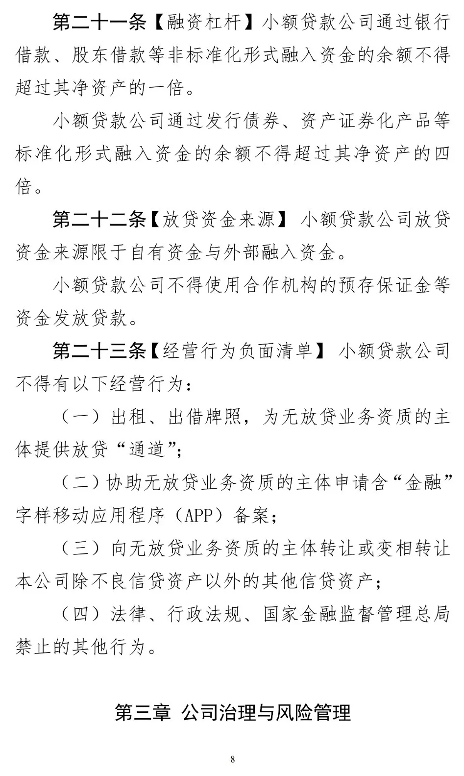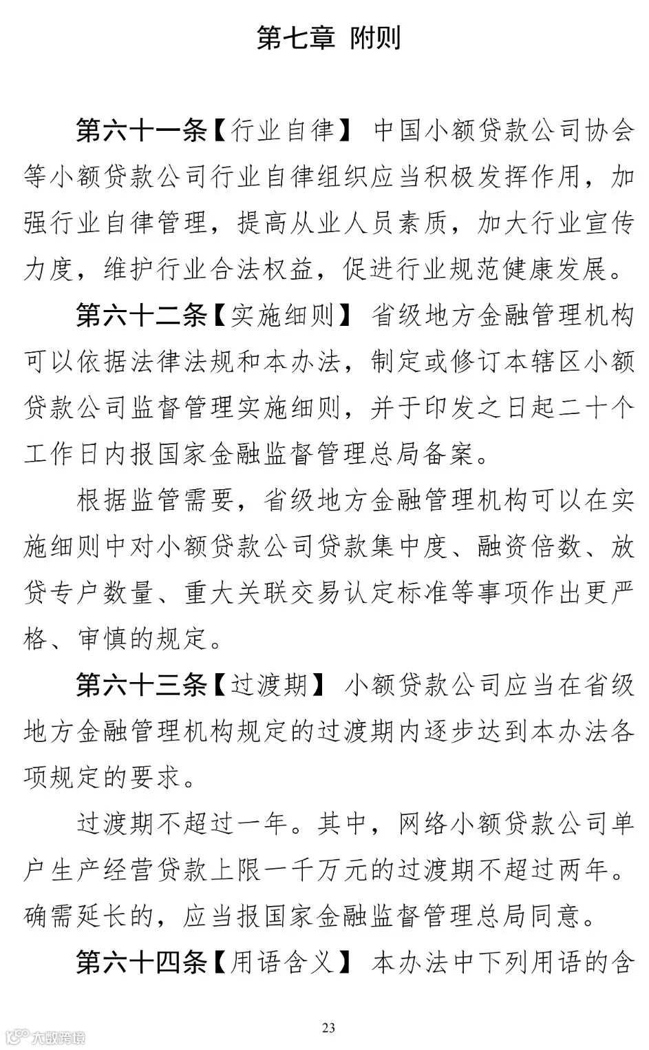 为规范小额贷款公司行为,加强监督管理,促进小额贷款公司稳健经营、健康发展,国家金融监督管理总局研究制定了《小额贷款公司监督管理暂行办法(征求意见稿)》(以下简称《暂行办法》),日前正式向社会公开征求意见。《暂行办法》共七章、六十六条,分别为总则、业务经营、公司治理与风险管理、消费者权益保护、非正常经营企业退出、监督管理、附则。