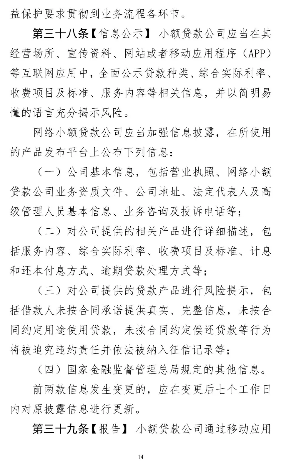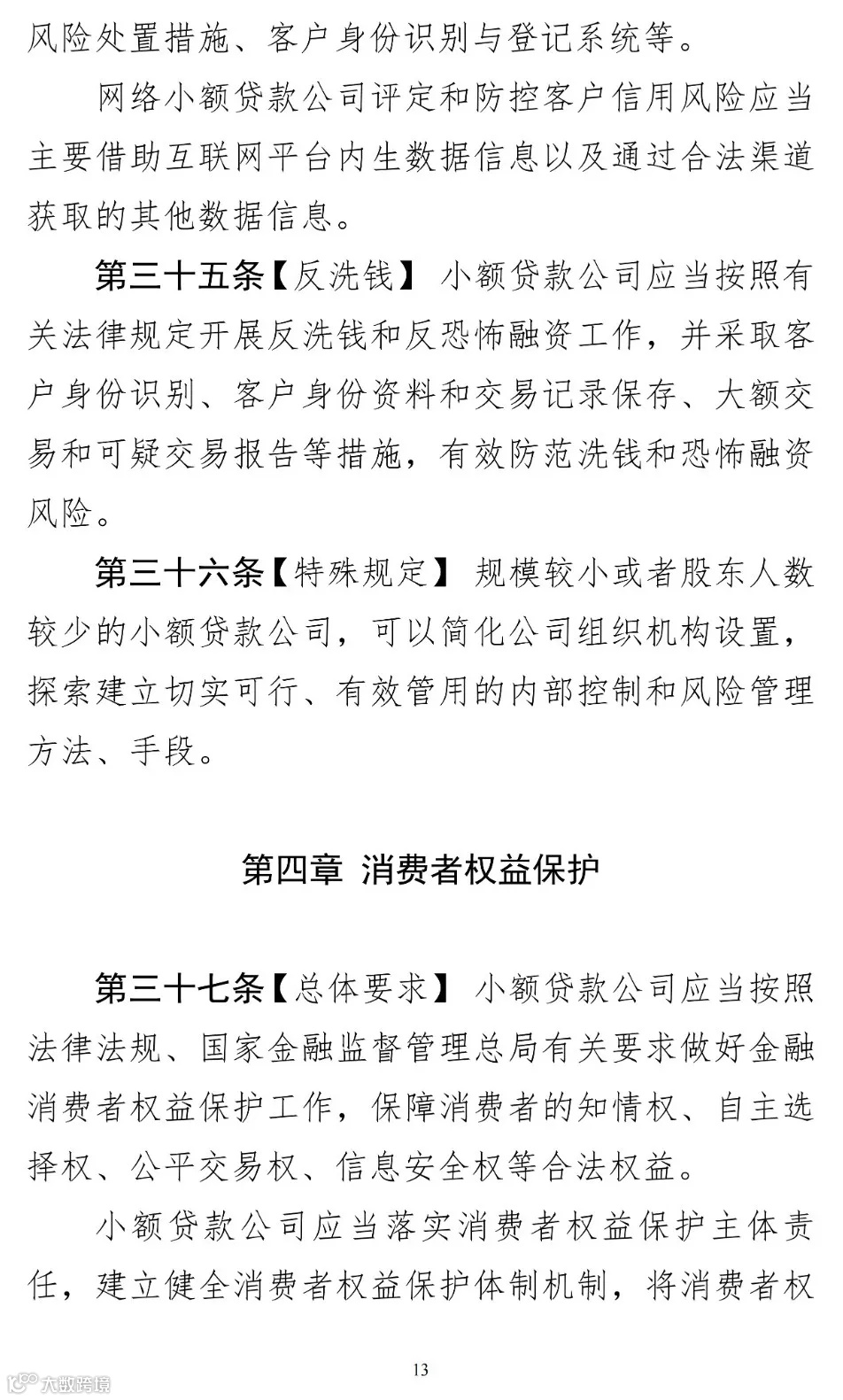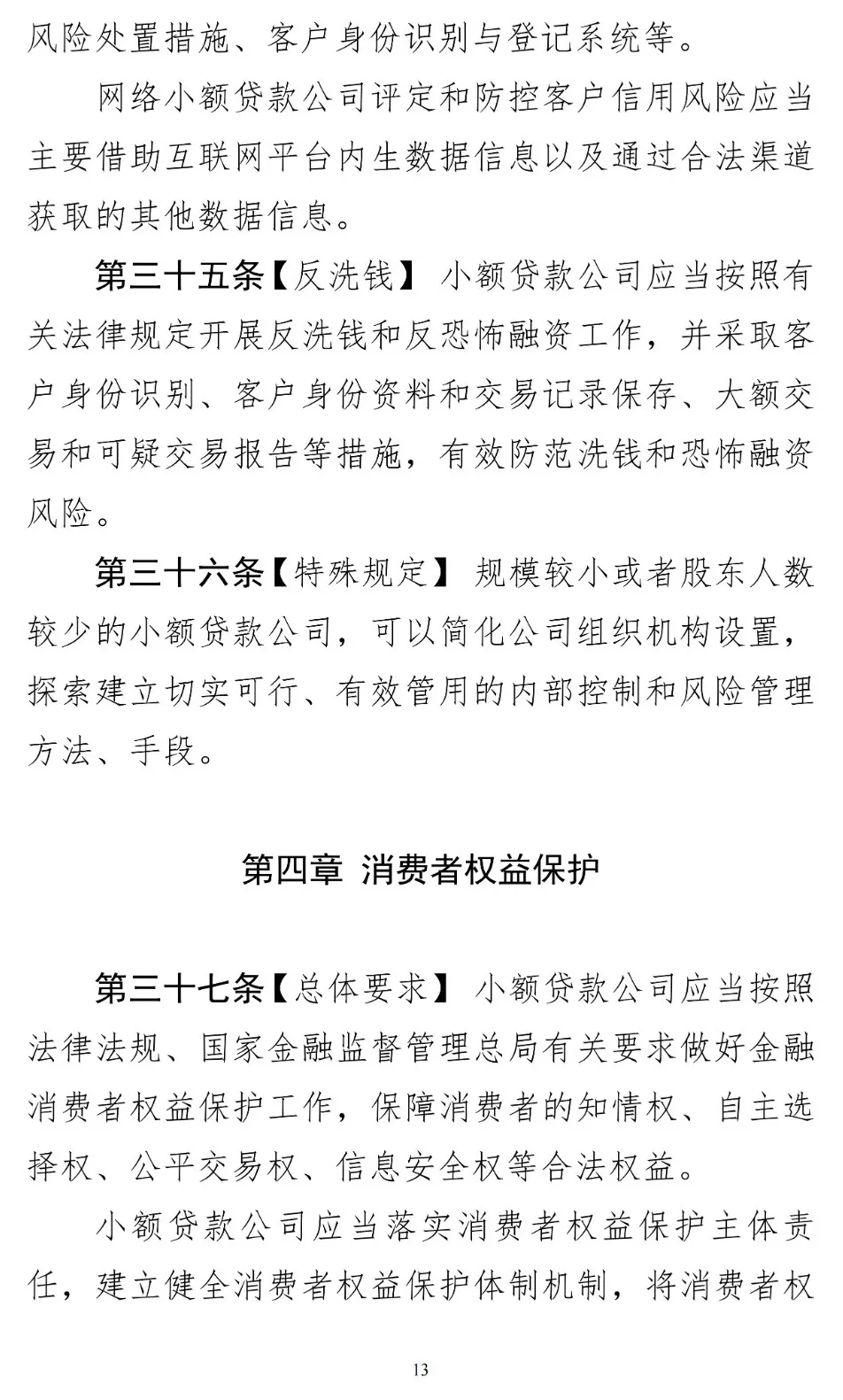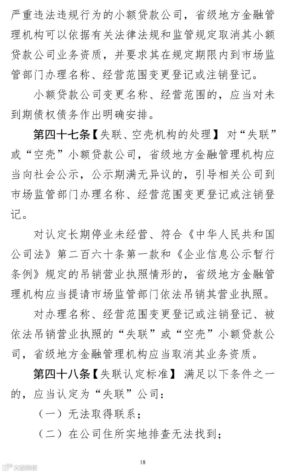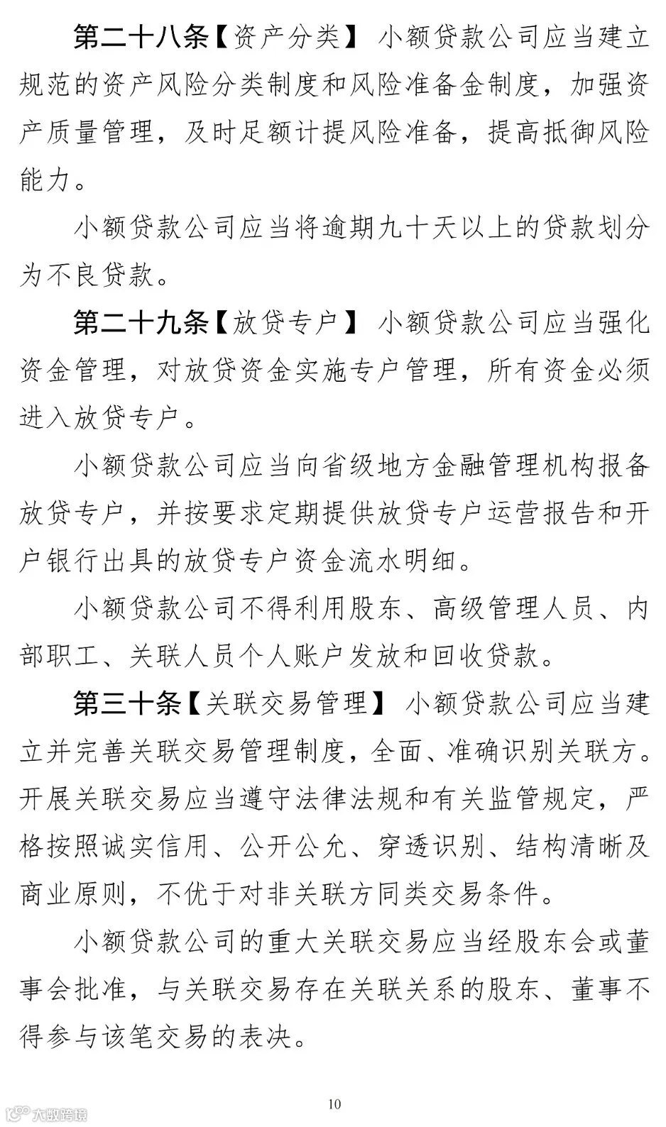 为规范小额贷款公司行为,加强监督管理,促进小额贷款公司稳健经营、健康发展,国家金融监督管理总局研究制定了《小额贷款公司监督管理暂行办法(征求意见稿)》(以下简称《暂行办法》),日前正式向社会公开征求意见。《暂行办法》共七章、六十六条,分别为总则、业务经营、公司治理与风险管理、消费者权益保护、非正常经营企业退出、监督管理、附则。